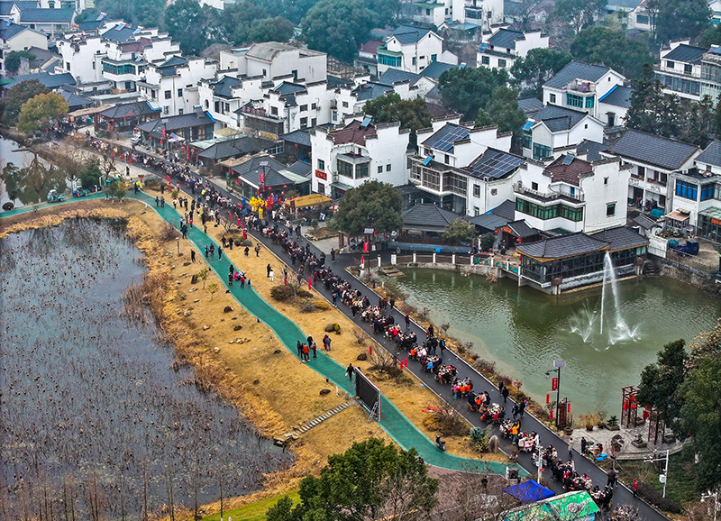 12月30日,人们在江苏省南京市高淳区体验长街宴(无人机照片)。
