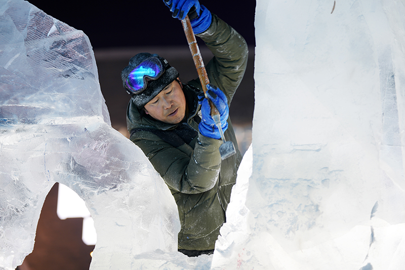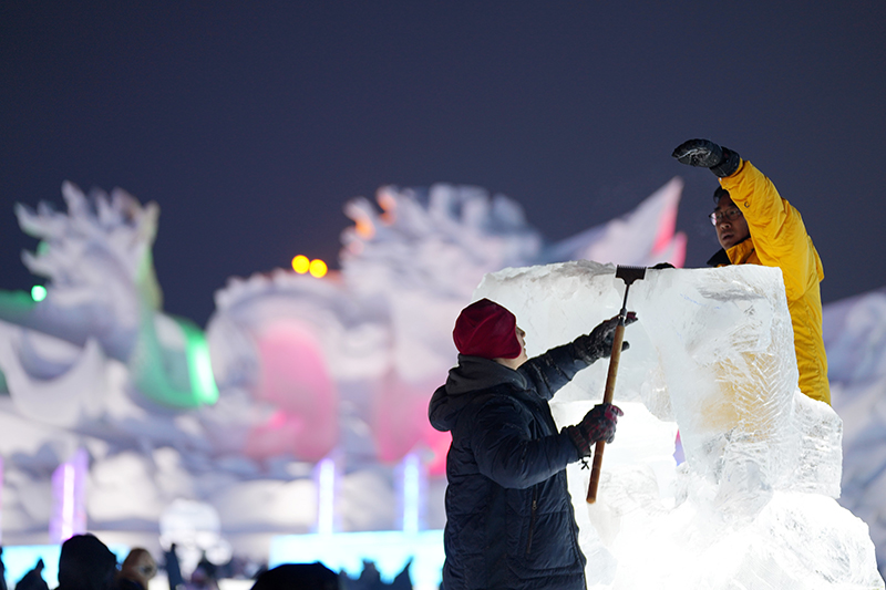 1月2日,在哈尔滨冰雪大世界园区内,参赛选手在进行冰雕创作。