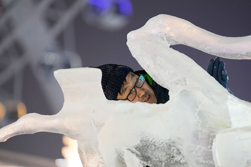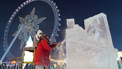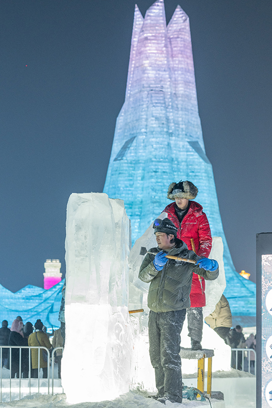 当日,为期3天的第35届中国·哈尔滨国际冰雕比赛在哈尔滨冰雪大世界园区开赛。来自世界各地的30余支参赛队伍同场竞技,切磋冰雕技艺。