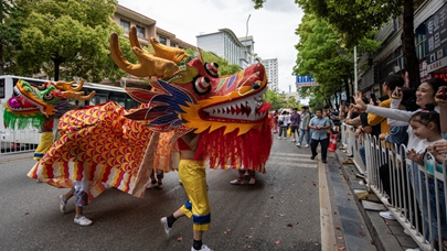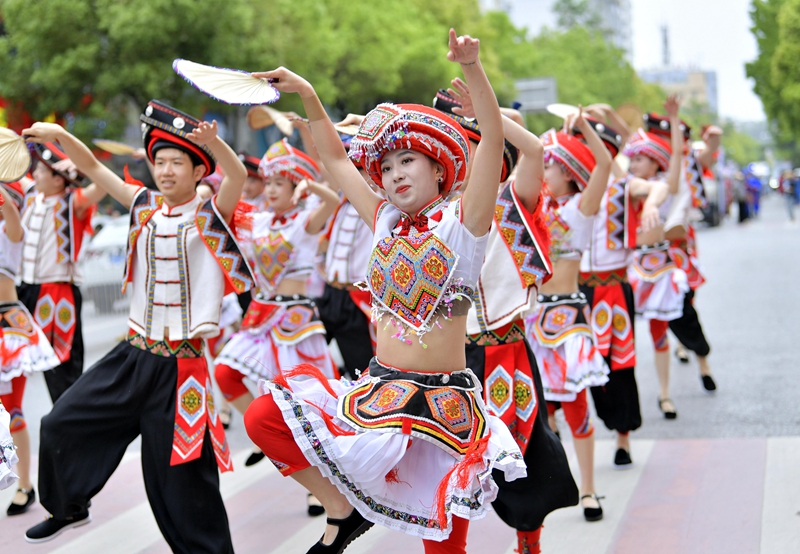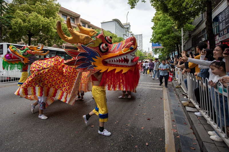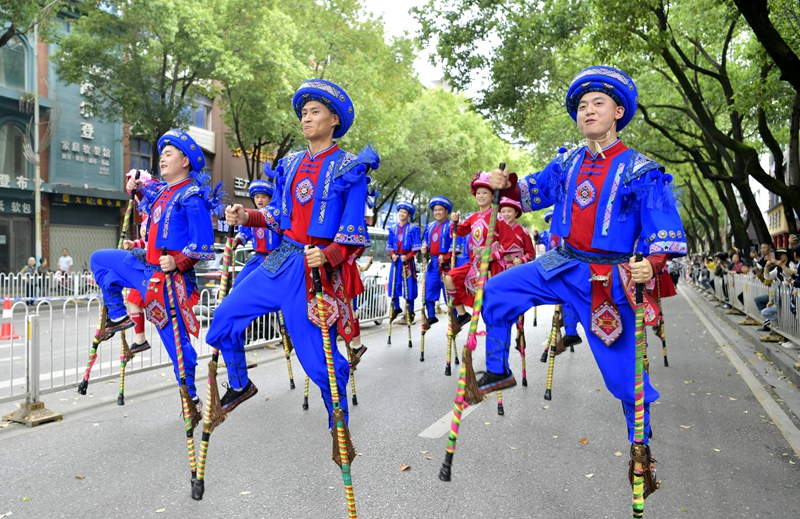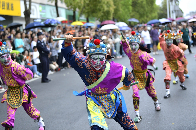 当日,湖北省恩施土家族苗族自治州来凤县举行非遗巡游活动,吸引来自广东、贵州、湖南等地的非遗爱好者参与。
