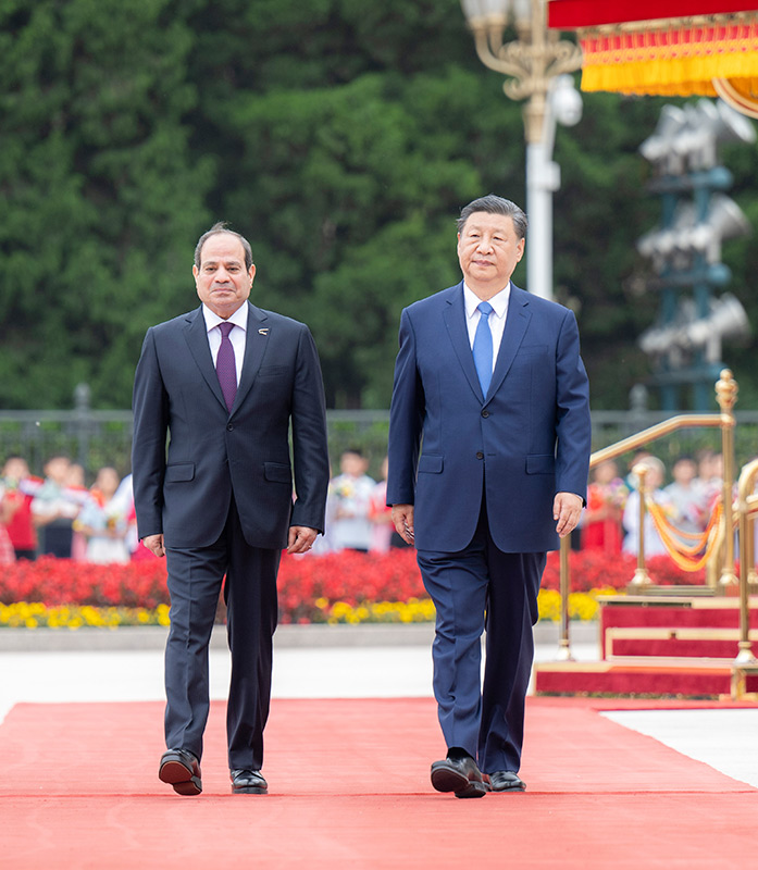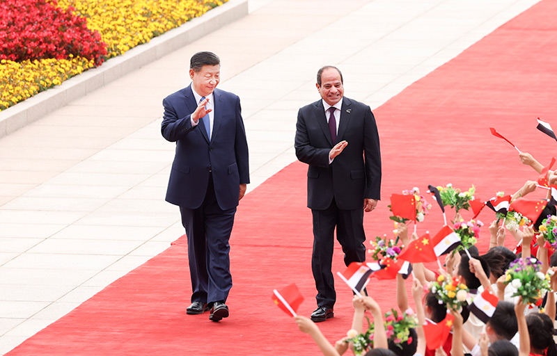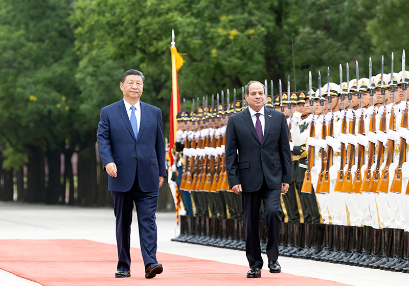 5月29日下午,国家主席习近平在北京人民大会堂同来华出席中国-阿拉伯国家合作论坛第十届部长级会议开幕式并进行国事访问的埃及总统塞西举行会谈。这是会谈前,习近平在人民大会堂东门外广场为塞西举行欢迎仪式。