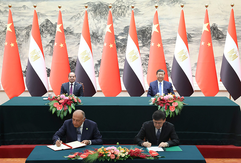 5月29日下午,国家主席习近平在北京人民大会堂同来华出席中国-阿拉伯国家合作论坛第十届部长级会议开幕式并进行国事访问的埃及总统塞西举行会谈。这是会谈后,两国元首共同见证签署多项双边合作文件。
