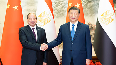 5月29日下午,国家主席习近平在北京人民大会堂同来华出席中国-阿拉伯国家合作论坛第十届部长级会议开幕式并进行国事访问的埃及总统塞西举行会谈。这是习近平同塞西握手。