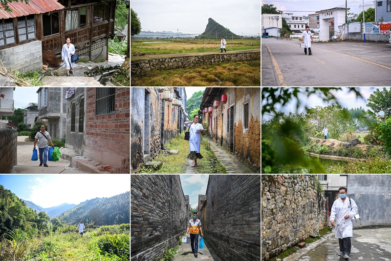这张拼版照片显示的是乡村医生们行走在出诊途中。 第一排从左至右: 广西龙胜各族自治县龙脊镇白石村乡村医生杨盛祺(2024年7月9日摄);广西钟山县石龙镇松桂村乡村医生潘绍瑜(2024年3月28日摄);广西河池市宜州区德胜镇上坪村乡村医生葛现克(2024年8月15日摄)。第二排从左至右:广西上思县南屏瑶族乡英明村乡村医生王卫江(2019年8月22日摄);广西武宣县东乡镇河马村乡村医生江凤英(2020年6月20日摄);广西贵港市港北区大圩镇中西村乡村医生黄增亮(2023年11月29日摄)。第三排从左至右:广西钟山县花山瑶族乡林坪村乡村医生唐丽红(2023年12月6日摄);广西兴业县石南镇谭良村乡村医生李志辉(2020年5月3日摄);广西天等县龙茗镇益山村乡村医生黄日雷(2020年4月22日摄)。