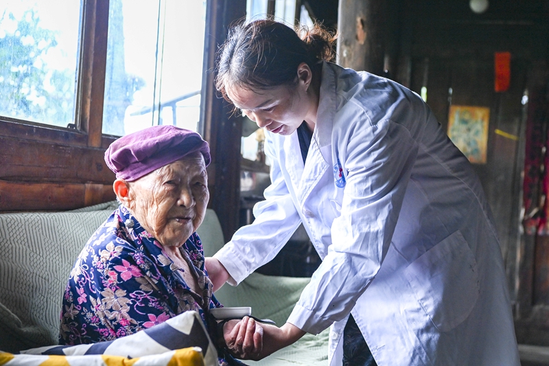在广西龙胜各族自治县龙脊镇白石村,乡村医生杨盛祺(右)上门为村民测量血压(2024年7月9日摄)。