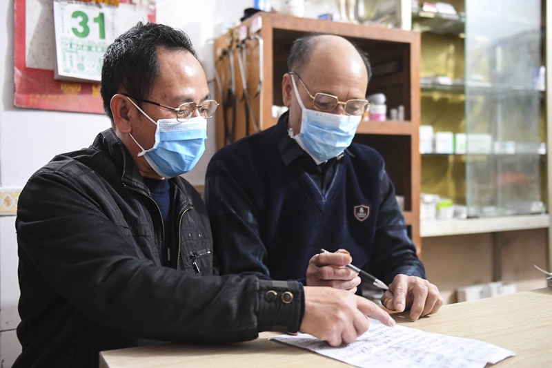 广西东兴市江平镇氵万(左“氵”右“万”,音同“万”)尾村,京族医生谭国仕(左)与冯满洲一起讨论药方(2020年3月31日摄)。