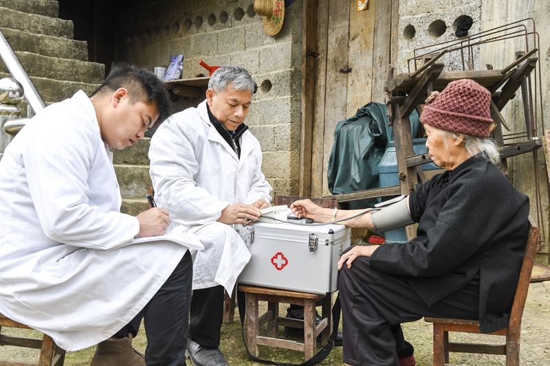 在广西那坡县平孟镇弄汤村,乡村医生赵建华(左二)与赵刚(左一)给村民测量血压(2021年3月11日摄)。