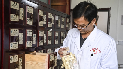 在广西钟山县石龙镇松桂村卫生室,乡村医生潘绍瑜在检查中药材的储存情况(2024年3月28日摄)。