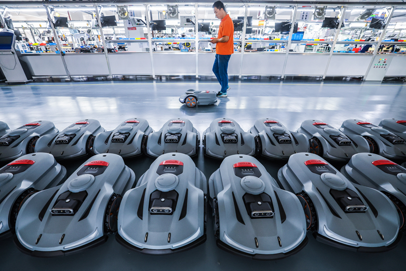 10月23日,在位于金华市金义新区的浙江白马科技有限公司车间里,工作人员测试智能割草机器人。浙江白马科技有限公司是国内规模较大的园林设备生产商,产品以出口为主。