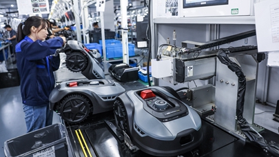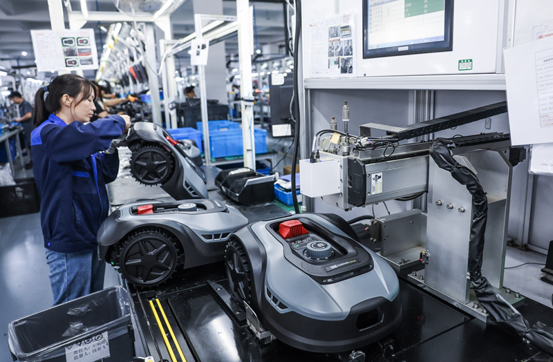 10月23日,在位于金华市金义新区的浙江白马科技有限公司生产车间,工人组装智能割草机器人。浙江白马科技有限公司是国内规模较大的园林设备生产商,产品以出口为主。