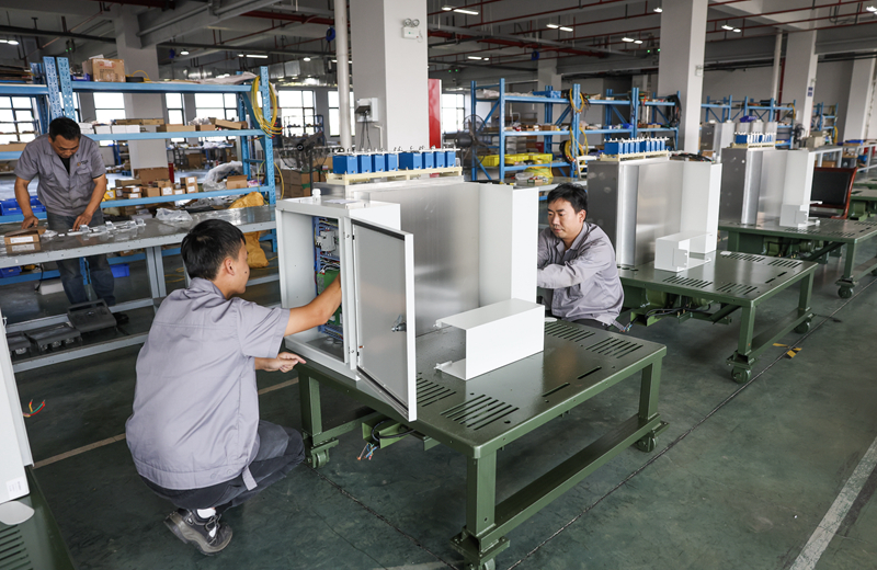 10月23日,在位于金华市金义新区的浙江大维高新技术股份有限公司生产线上,工人组装高频控制箱。浙江大维高新技术股份有限公司是一家研发绿色低碳化、数智化技术产品的高新技术企业。