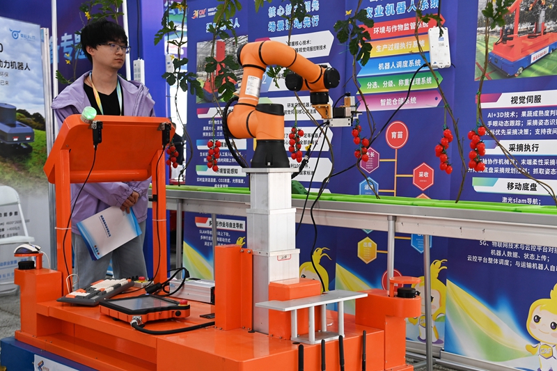 10月25日,工作人员在杨凌农高会展示一台自动采摘机器人。