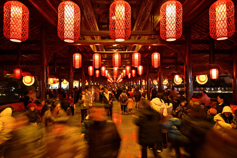 1月29日,人们在湖北省宣恩县城风雨桥游玩。