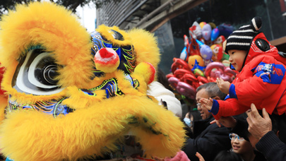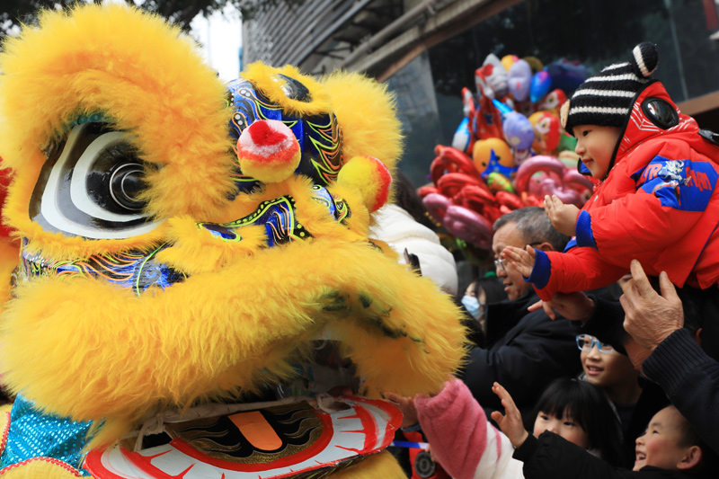1月29日,在四川省广安市武胜县民俗文化巡游活动中,小朋友与醒狮互动。