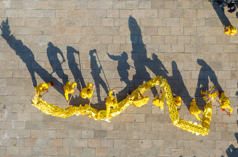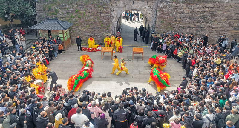 1月30日,在浙江省临海市台州府城,民间艺人在表演国家级非物质文化遗产“临海黄沙狮子”,吸引众多市民和游客观看(无人机照片)。