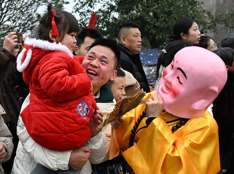 1月29日,在四川省南充市蓬安县举行的“文化贺新春 民俗大拜年”新春民俗文艺巡游活动中,表演者与观众互动。