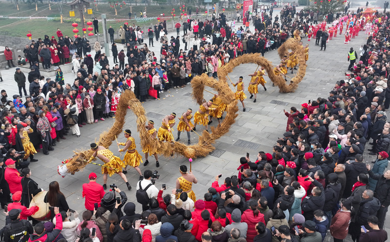 1月29日,民间艺人在四川省南充市蓬安县相如故城表演舞草龙(无人机照片)。