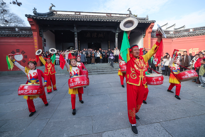 1月30日,演员在浙江嘉兴海宁市盐官镇的盐官潮乐之城为游客表演盐官盘鼓。