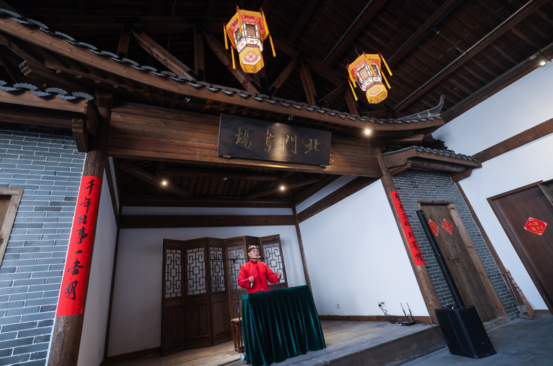 1月30日,演员在浙江嘉兴海宁市盐官镇的盐官潮乐之城为游客表演说书。