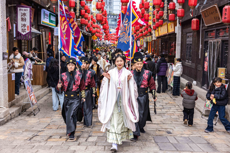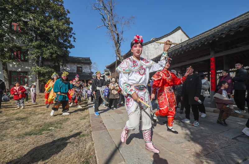 1月30日,演员在浙江嘉兴海宁市盐官镇的盐官潮乐之城为游客表演英歌舞巡游。