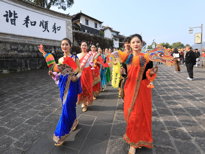 1月30日,在云南省腾冲市和顺镇,游客观看东南亚风情服装花式巡游。