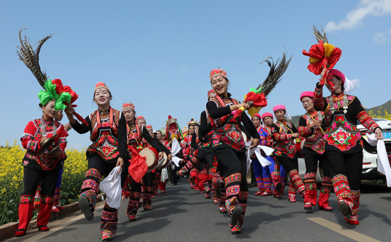 1月30日,云南省玉溪市峨山彝族自治县塔甸镇瓦哨宗村群众在表演彝族歌舞。