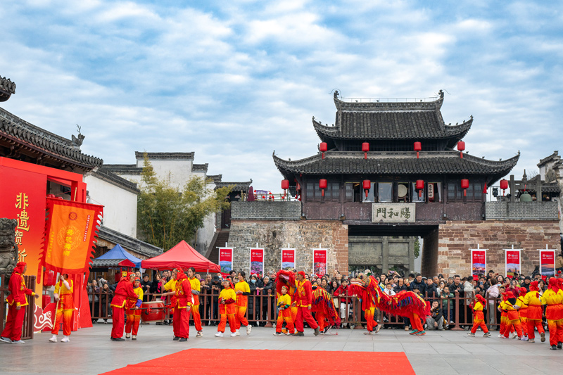 1月30日,游客在安徽省黄山市歙县徽州古城观看舞狮表演。