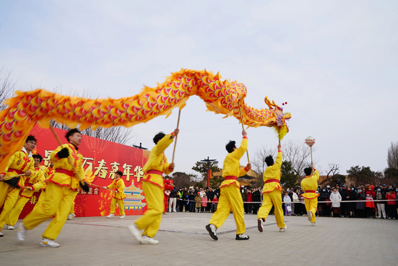 1月30日,游客在北京景山公园欣赏舞龙演出。