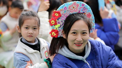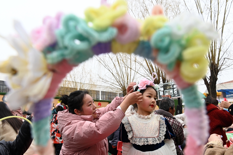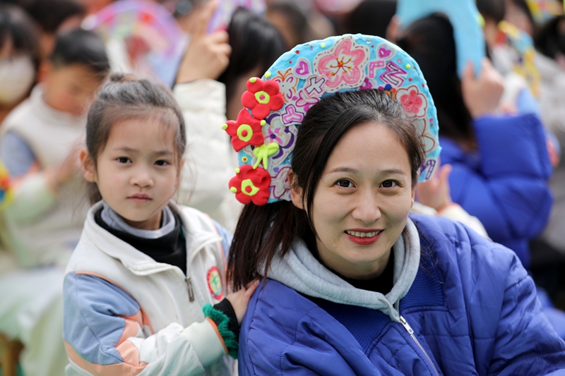 3月5日,在河南省沁阳市第一幼儿教育集团白庄村幼儿园,妈妈和孩子一起制作簪花。