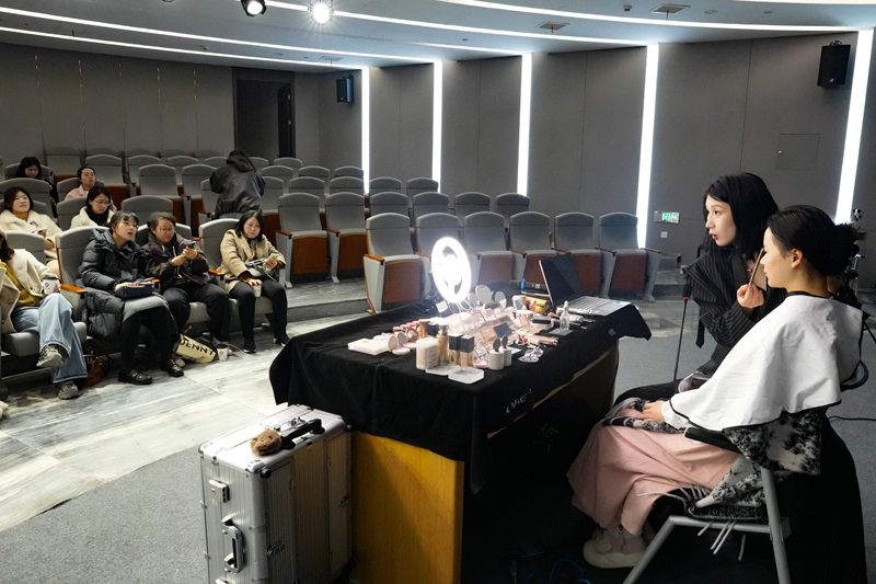 3月6日,人们在美妆讲堂学习化妆知识。当日,浙江省湖州市美妆小镇开启美好生活节,设置美妆课堂、香氛展览、美妆购物等活动,吸引众多女性观众前来参加。