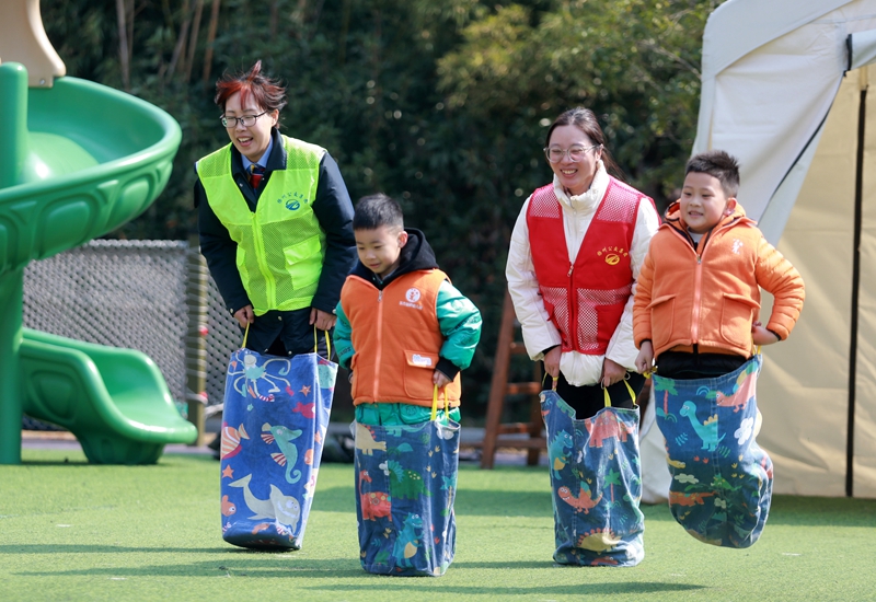 3月6日,江苏省扬州市公交集团四分公司与江苏省扬州市邗江区一所幼儿园联合开展趣味运动迎“三八”活动,扬州市公交集团四分公司的志愿者和孩子们一起做趣味游戏。