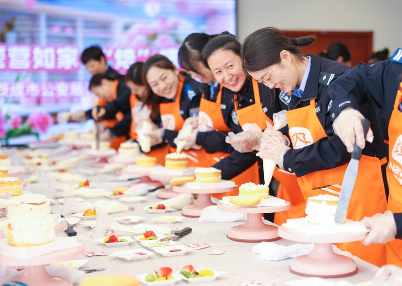3月6日,在山东省荣成市公安局活动室,女警们在DIY蛋糕制作活动中体验做蛋糕。