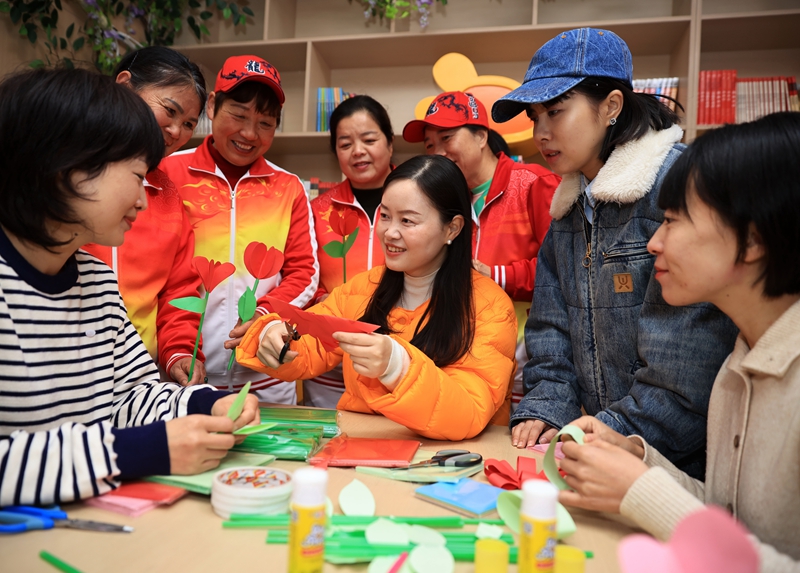 3月6日,在湖北武汉,志愿者和武汉市未来实验美林小学女教师参加纸工艺制作活动。