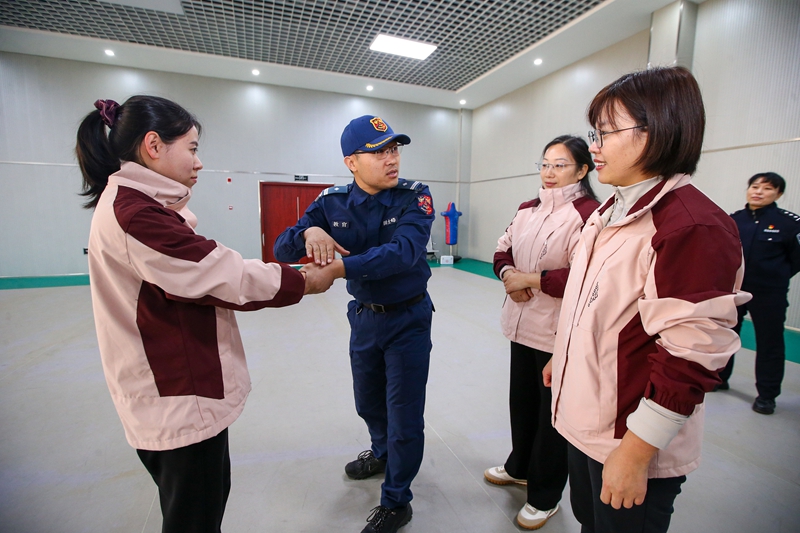 3月6日,在山东省济南市公安局人民警察训练基地,北康社区妇女在民警的指导下学习女子防身术。