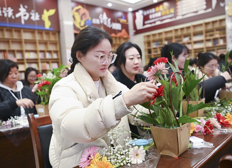 3月5日,在浙江省湖州市埭溪镇成人文化技术学校举办的“迎三八”主题活动上,妇女们在学习插花。