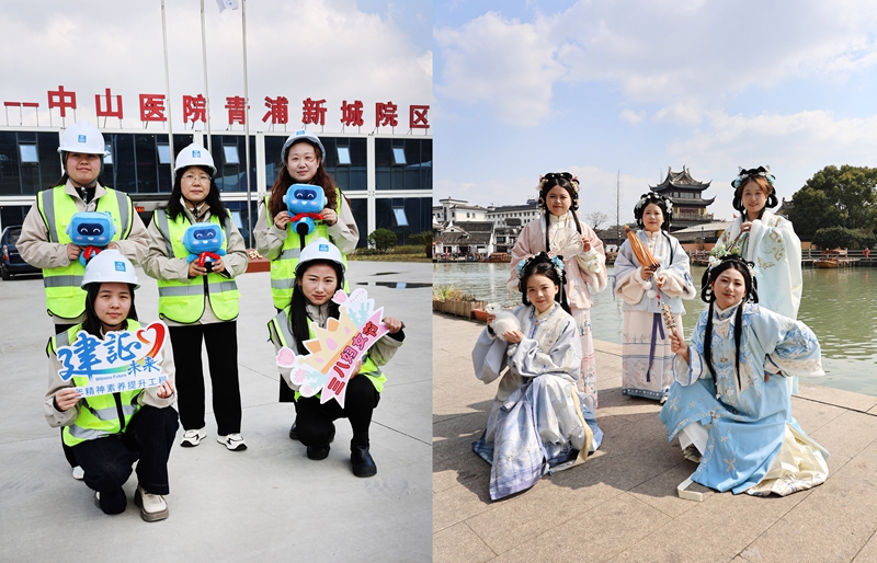 3月6日,中建二局中山医院青浦新城院区项目部女职工身着工装在项目部(左)和身着汉服在朱家角古镇(右)合影(拼版照片)。