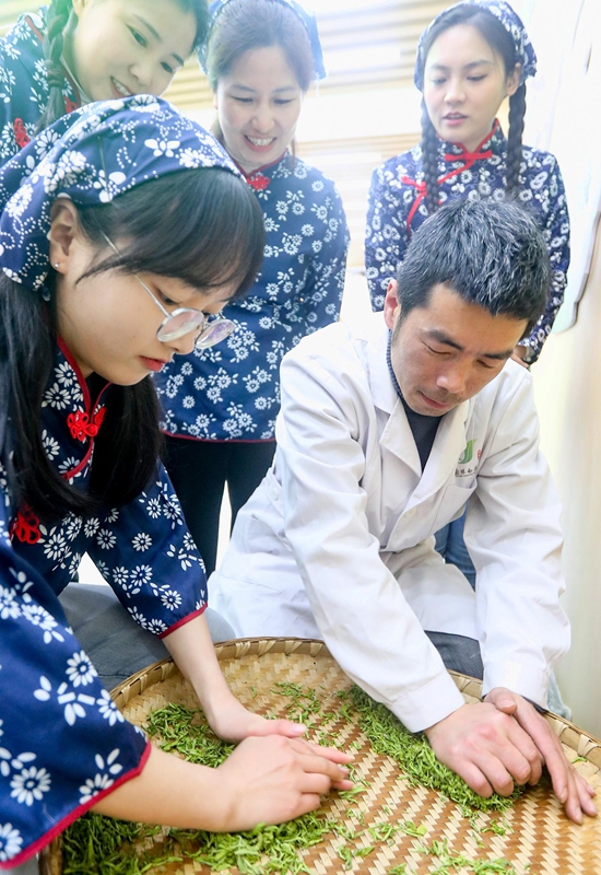 3月6日,四川省华蓥市融媒体中心的女记者来到广安市前锋区龙滩镇水源村,体验茶叶炒制,感受茶文化魅力。