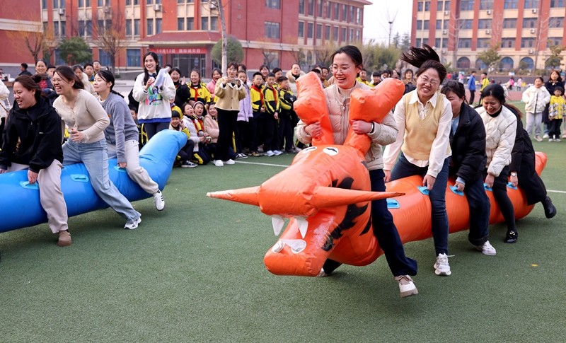 3月6日,山东省枣庄市市中区东湖小学女教师参加“旱地龙舟”趣味比赛。