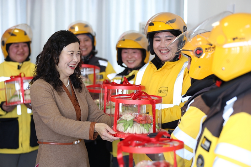 3月6日,山东省临沂市郯城县快递物流行业妇联工作人员为外卖女骑手送上面点食品。