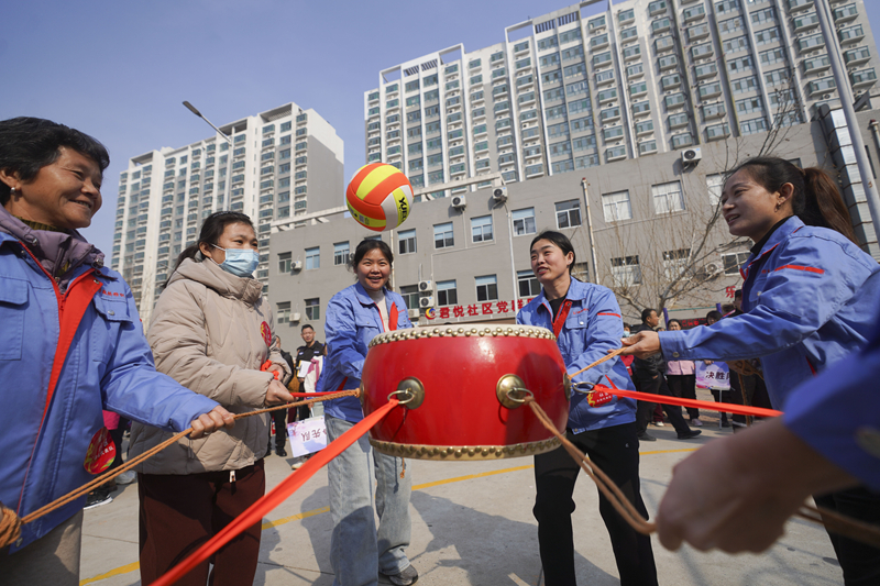 3月6日,在山东省邹平市高新街道君悦社区“巾帼绽芳华”运动会上,妇女们参加齐鼓颠球比赛。