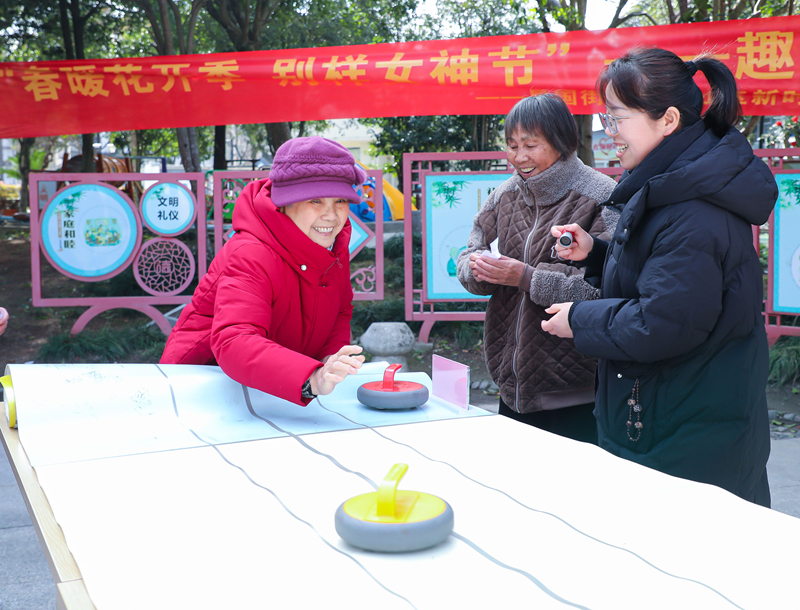 3月6日,在浙江省舟山市定海区昌国街道香园社区,居民参加“三八”国际妇女节趣味活动。
