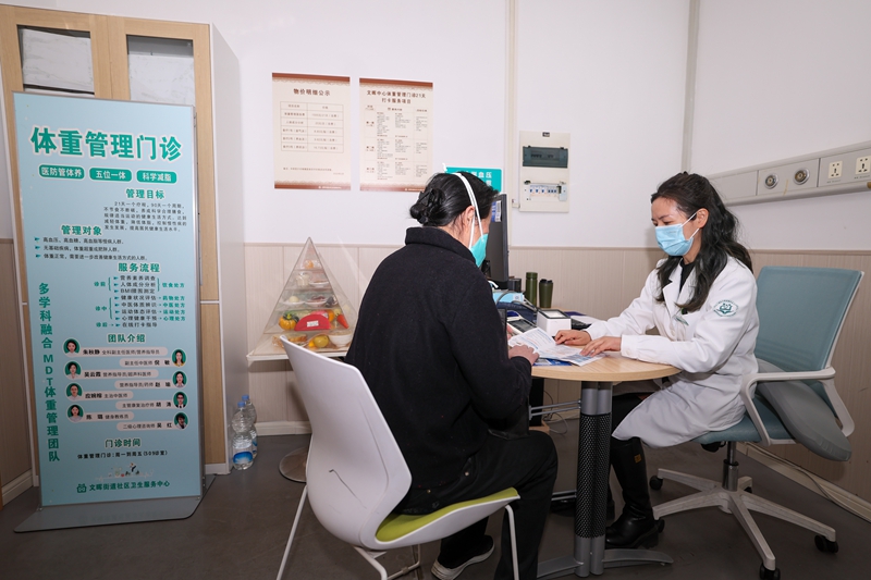 3月17日,市民(左)在杭州市拱墅区文晖街道社区卫生服务中心体重管理门诊就诊。