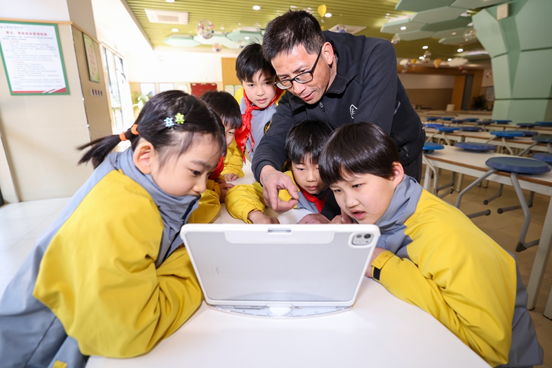 3月17日,杭州市长寿桥岳帅小学后勤教师为学生讲解健康均衡膳食知识。