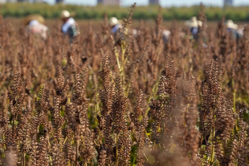 9月23日,黑龙江省佳木斯市桦南县举办庆祝中国农民丰收节活动,工作人员进行紫苏收获展示。