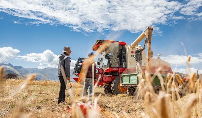 9月23日,在西藏拉萨市林周县松盘乡岗巴村,农民用收割机收获青稞。