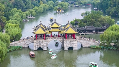 10月1日,游客在江苏省扬州市瘦西湖风景区游玩(无人机照片)。