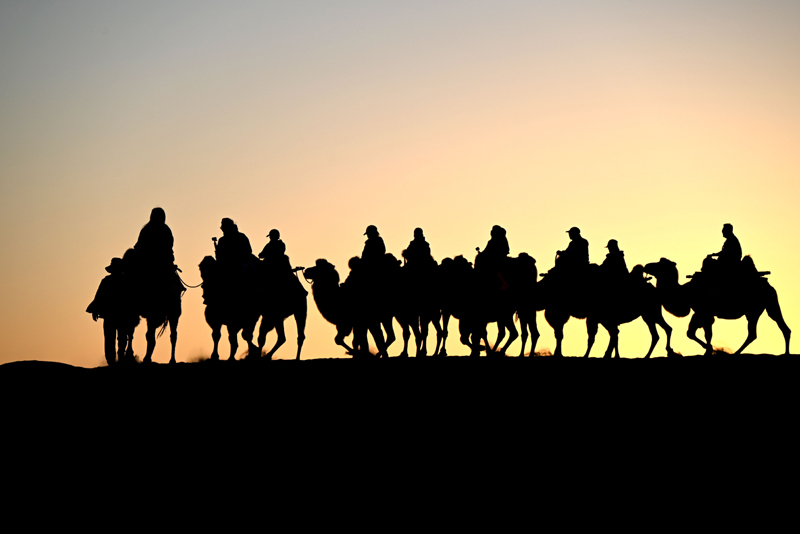 10月1日,游客在甘肃省敦煌市鸣沙山月牙泉景区游览。