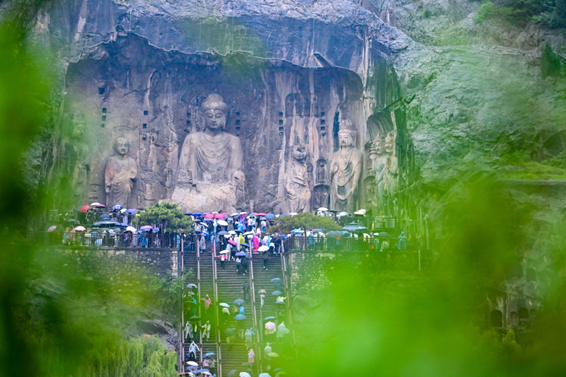 10月1日,游客冒雨游览位于河南洛阳的龙门石窟。
