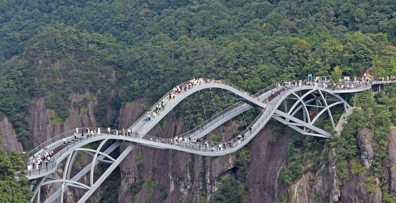 10月1日,游客在浙江省台州市仙居县神仙居景区如意桥上游览。