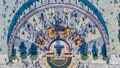 10月2日,游客在黑龙江省哈尔滨市防洪胜利纪念塔广场游玩(无人机照片)。